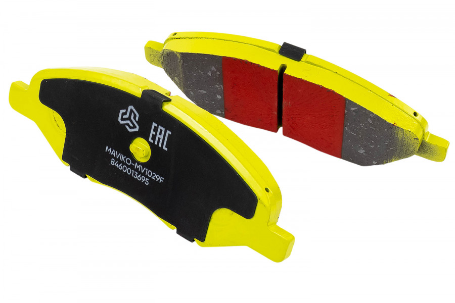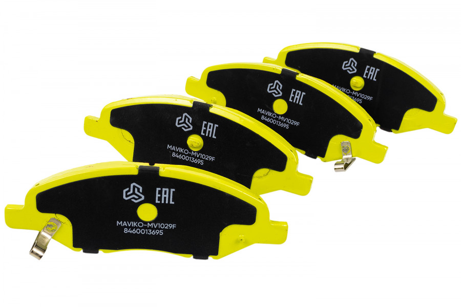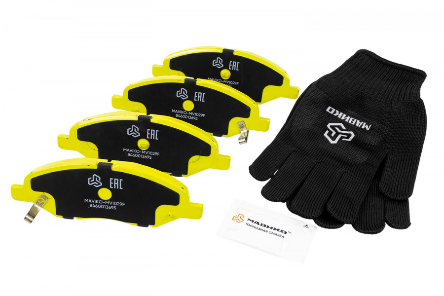 Колодки производства МАВИКО с характерным цветом «Лайм» имеют противоскрипные пластины и смазку в комплекте.