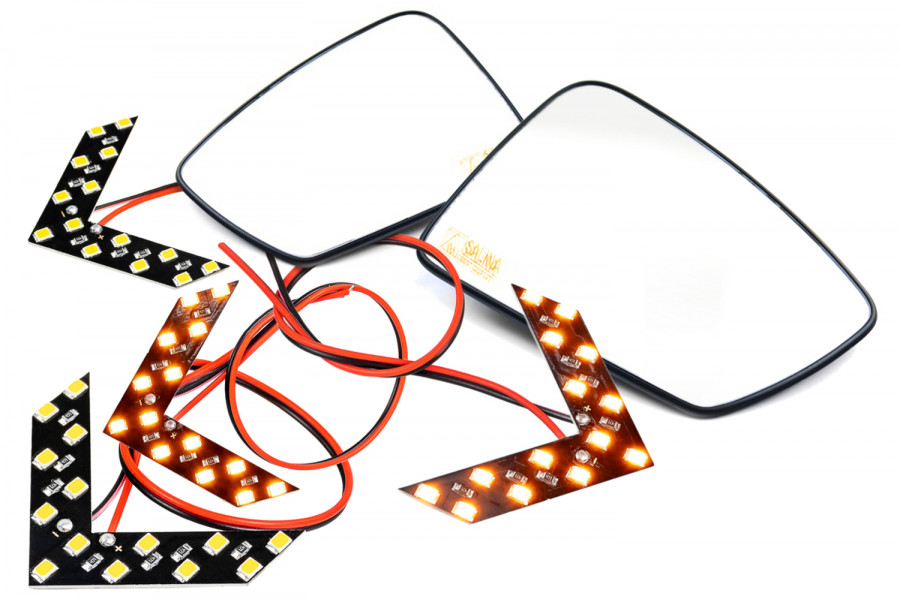 Диодные стрелки повторители поворотников устанавливаются непосредственно на зеркальный элемент под нагревательные элементы.
