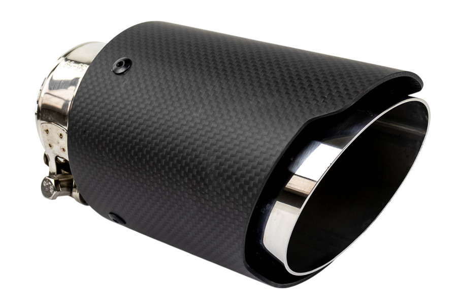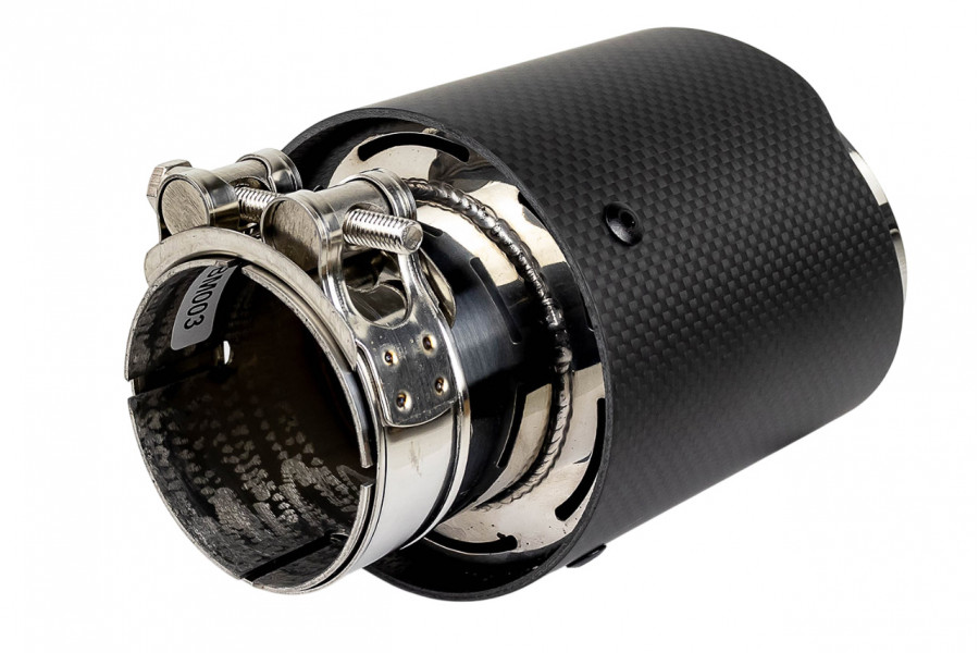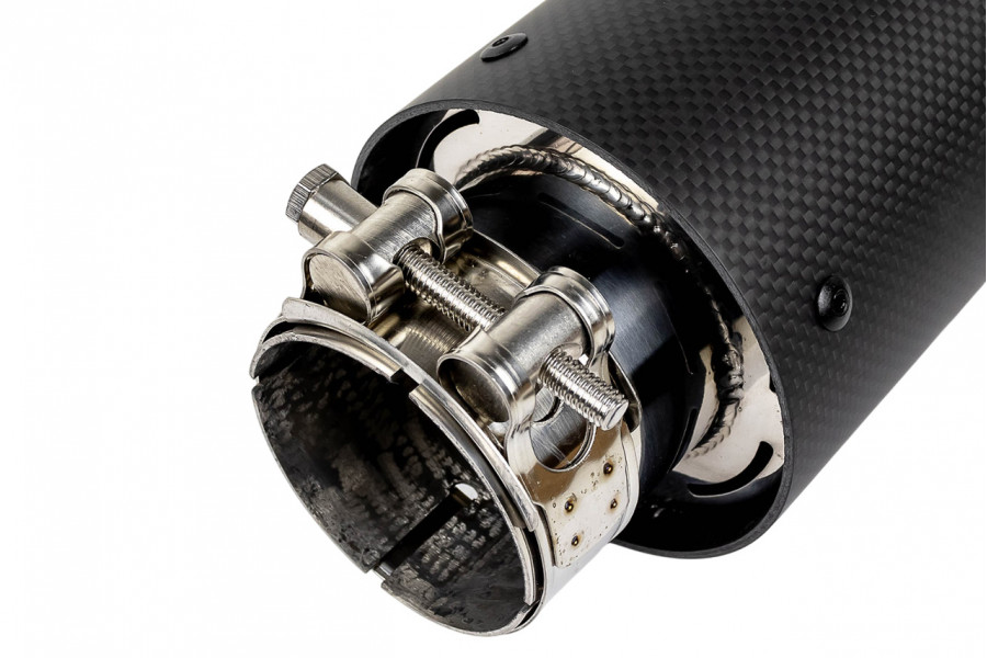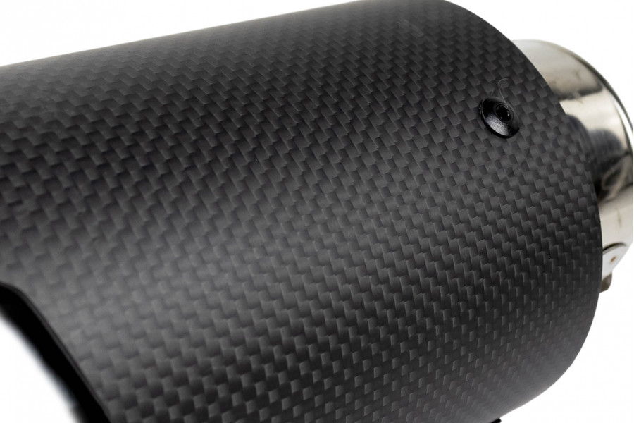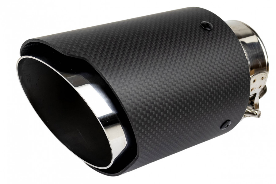 Насадка глушителя из нержавеющей cтали имеет фигурную накладку под карбон, круглую форму, а также скос и устойчива к окислению и коррозии.