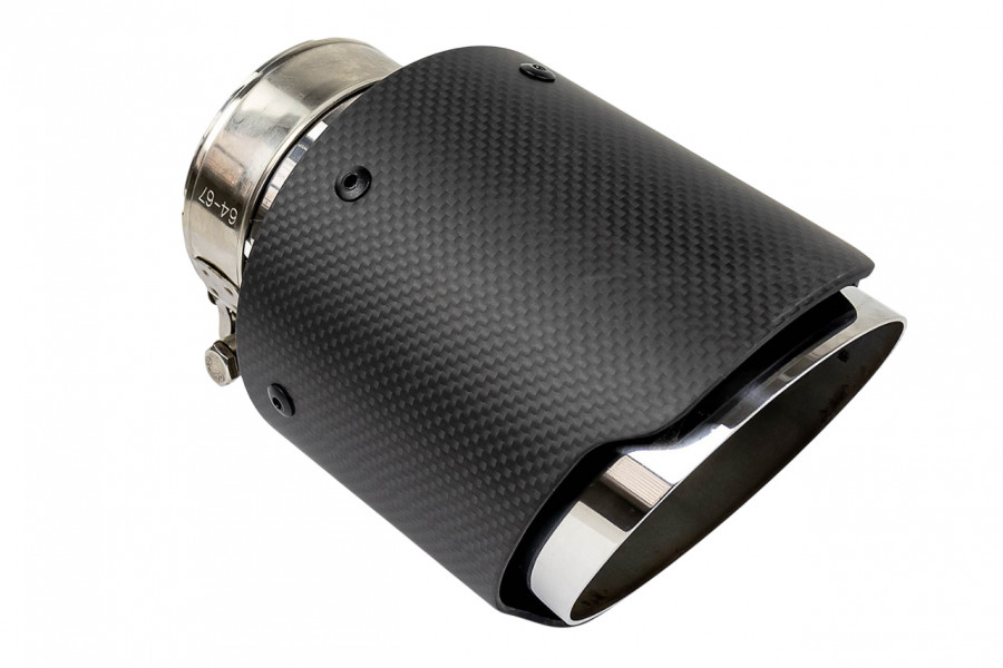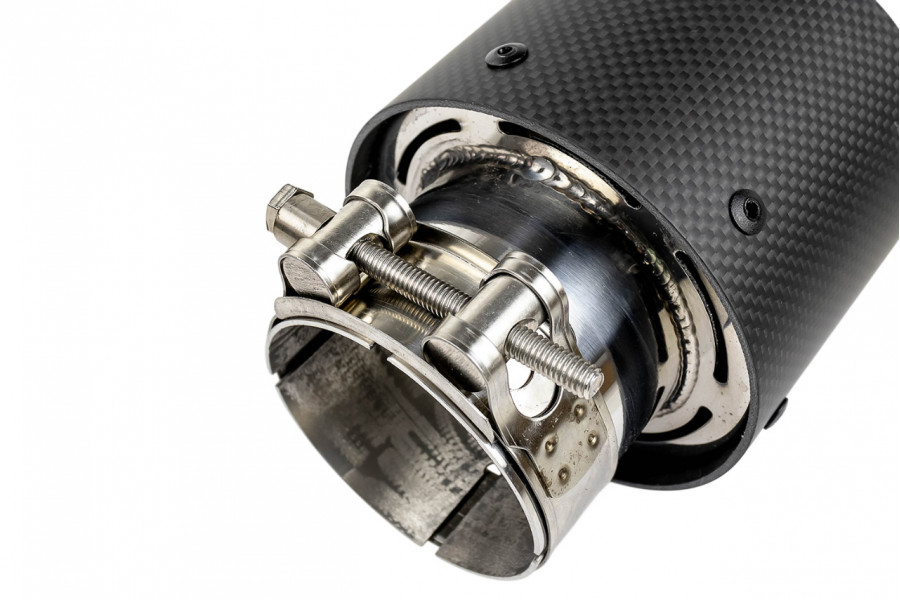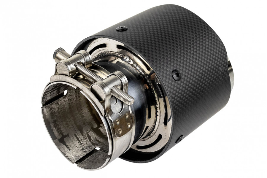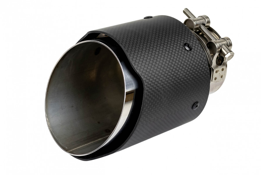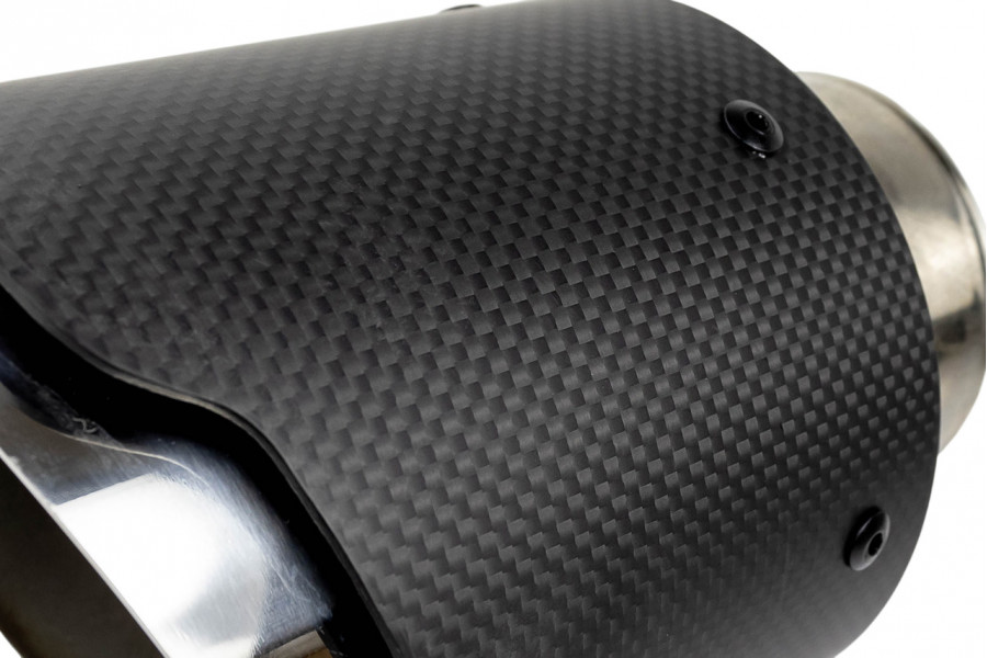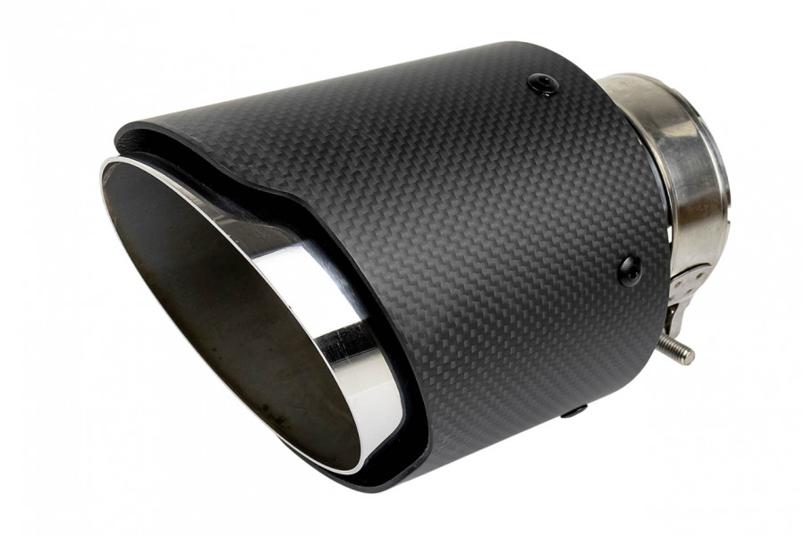 Насадка глушителя из нержавеющей cтали имеет фигурную накладку под карбон, круглую форму, а также скос и устойчива к окислению и коррозии.