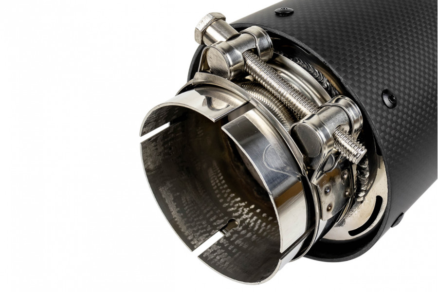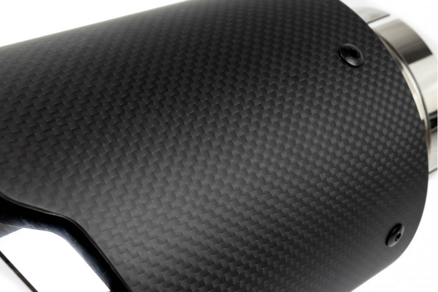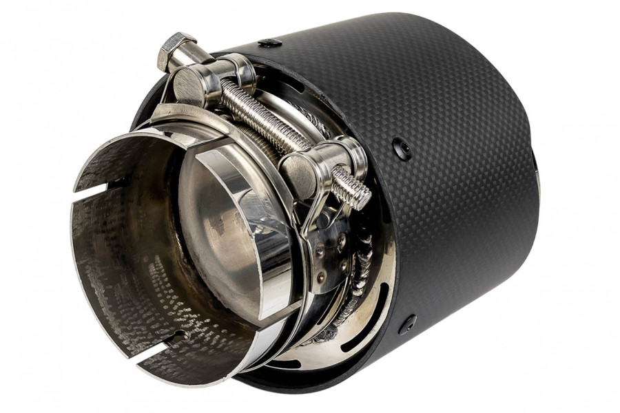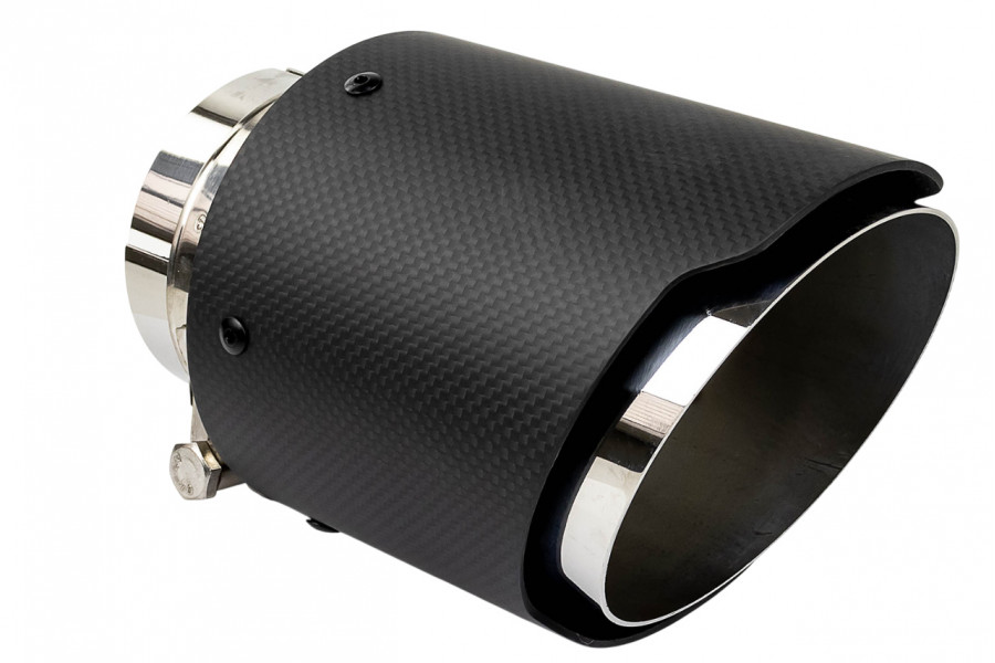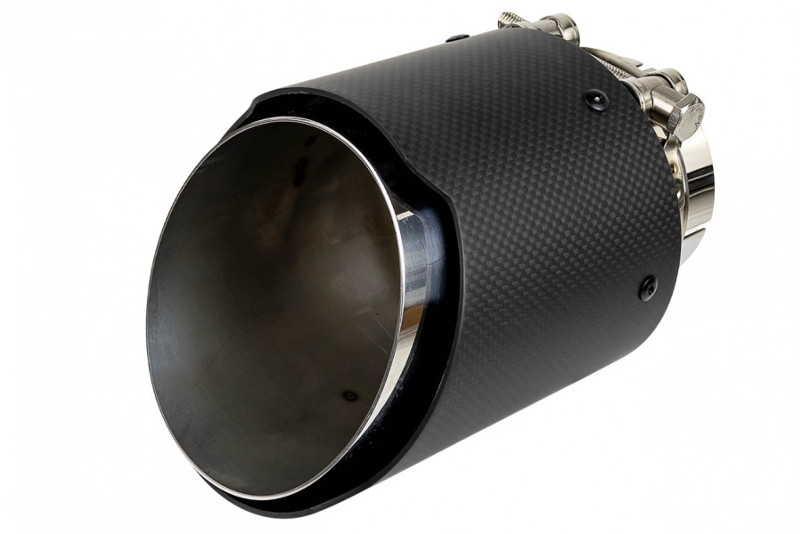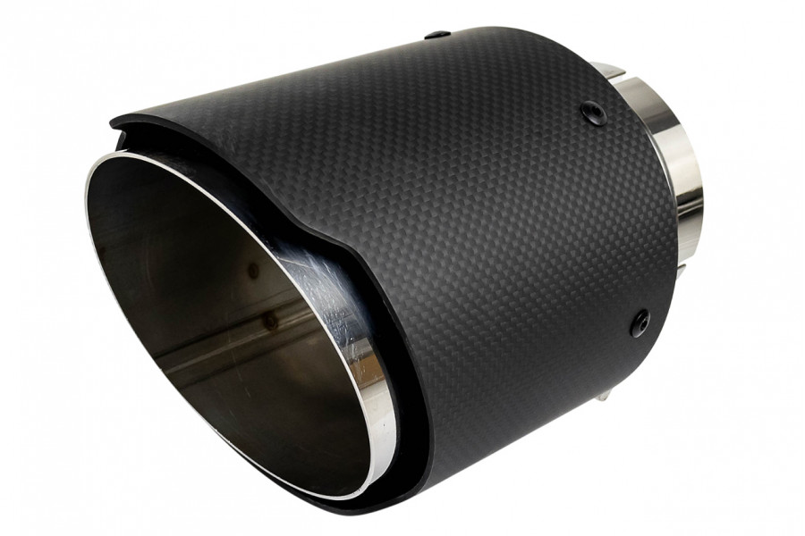Насадка глушителя из нержавеющей cтали имеет фигурную накладку под карбон, круглую форму, а также скос и устойчива к окислению и коррозии.
