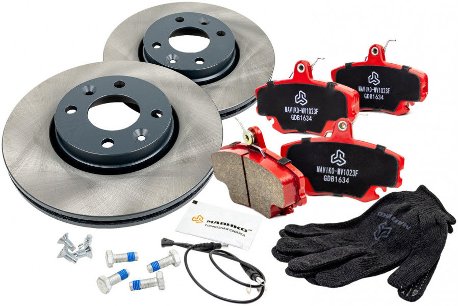 Передние тормозные колодки поставляются в комплекте с вентилируемыми тормозными дисками от зарекомендовавшего себя бренда МАВИКО.