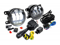Монтажный набор для противотуманных фар включает полный комплект необходимых комплектующих: провода, соединители, подрулевой переключатель, реле и сами противотуманки вместе с рамками для их ..