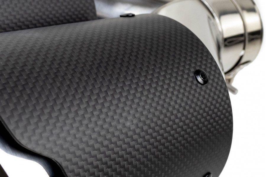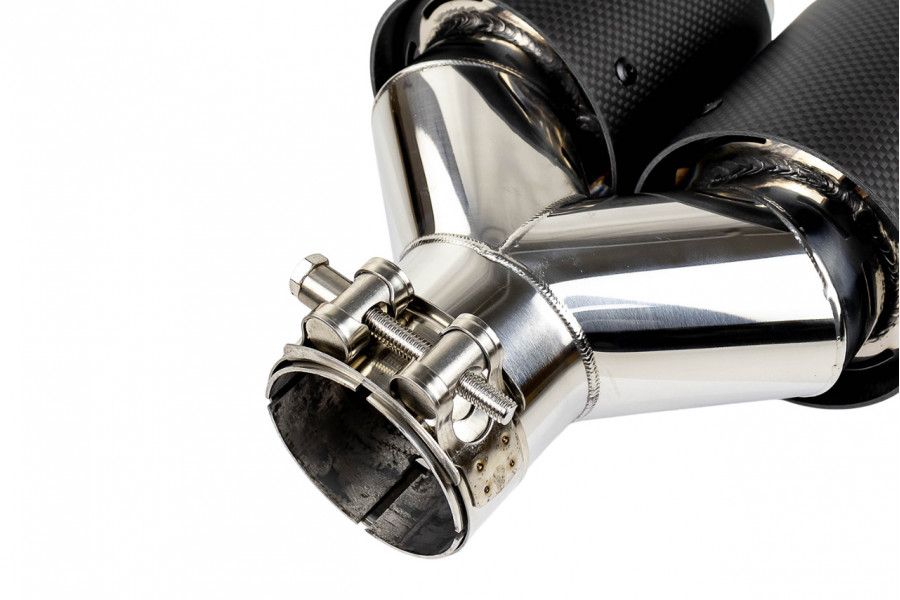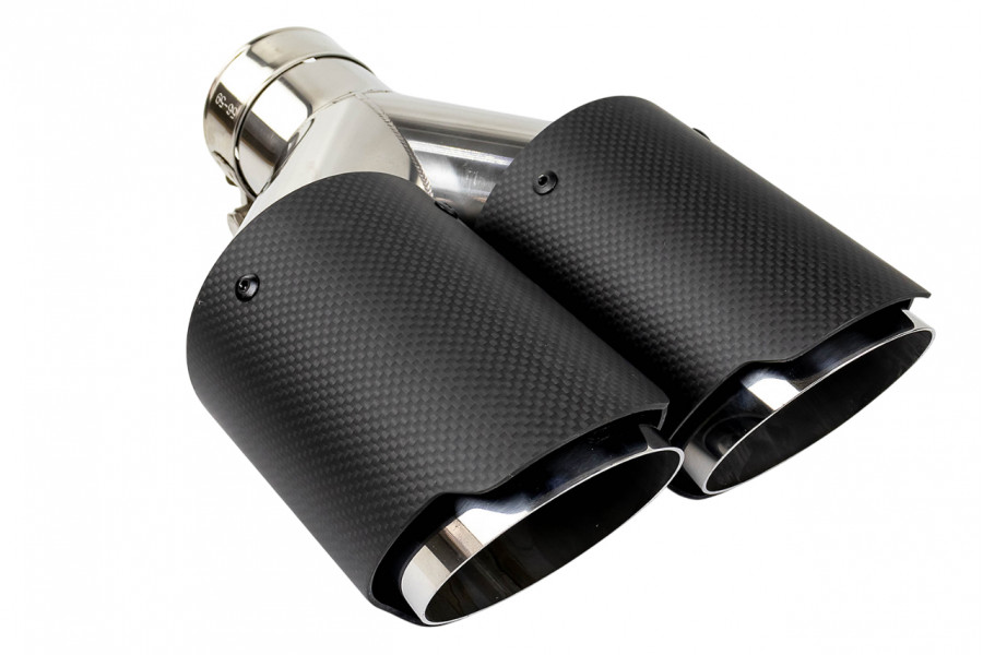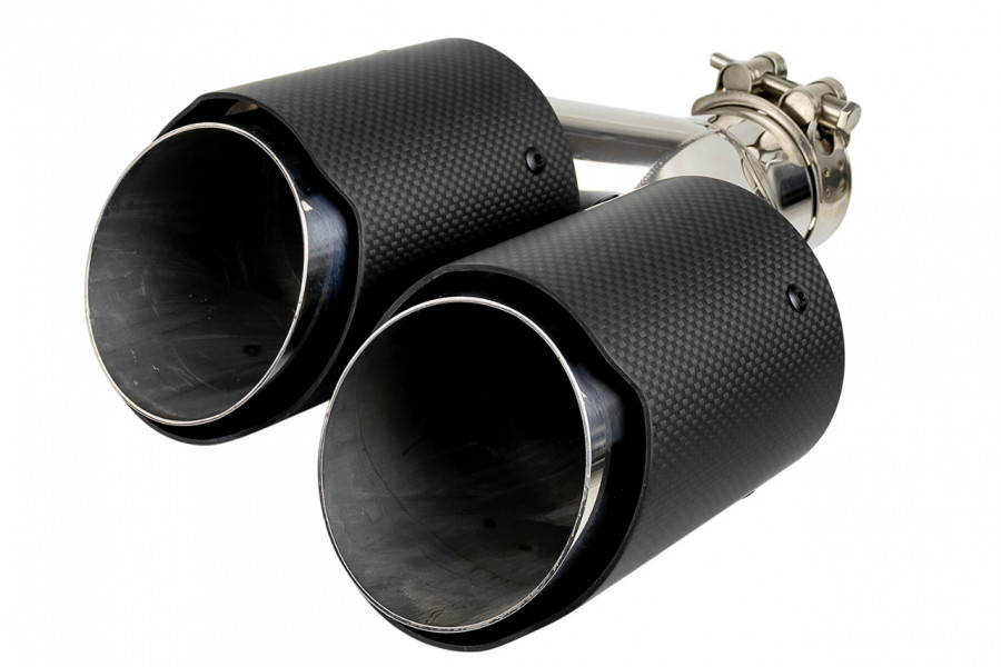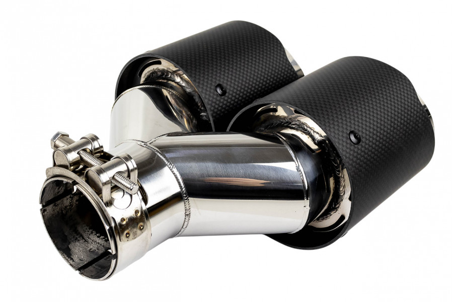 Раздвоенная насадка глушителя из нержавеющей cтали имеет фигурную накладку под карбон, а также скос и устойчива к окислению и коррозии.