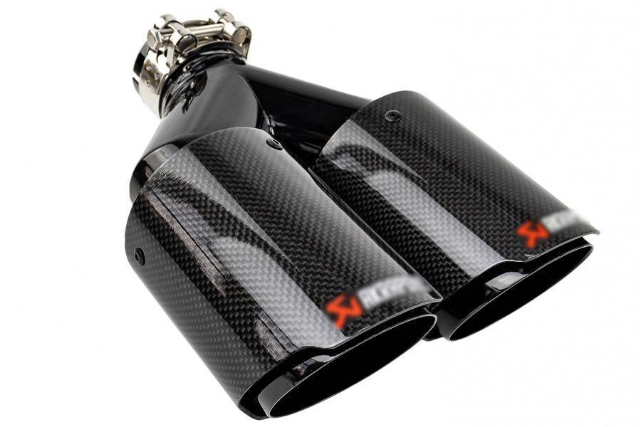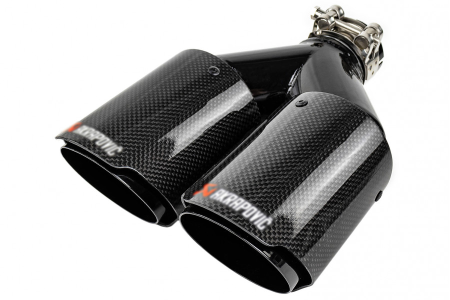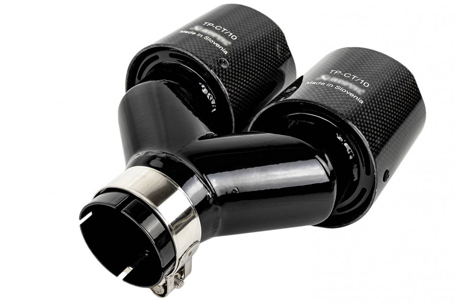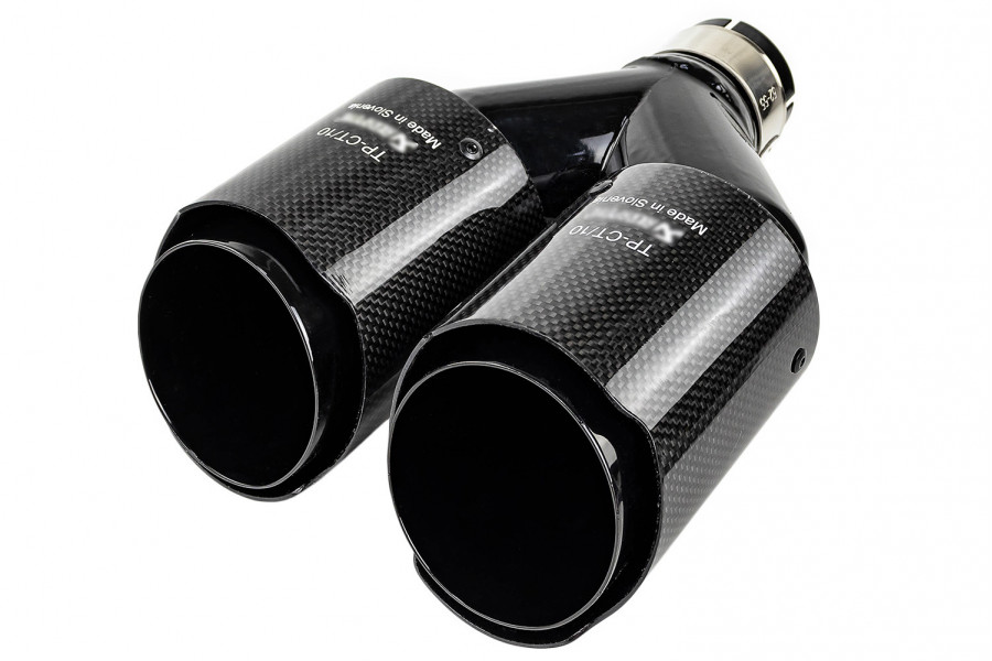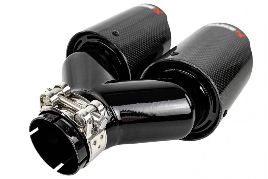 Раздвоенная насадка глушителя открытого типа из нержавеющей стали со скосом и накладками глянцевый карбон
