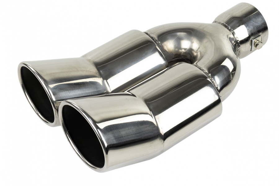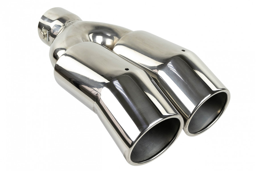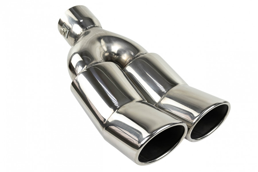 Раздвоенные насадки глушителя из нержавеющей cтали имеют скос, изогнуты кверху и устойчивы к окислению и коррозии.