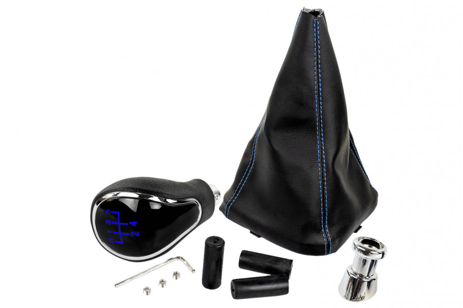 Ручка коробки передач с хромированной поверхностью и встроенной синей LED-подсветкой, дополненная пыльником с аккуратной синей строчкой — идеальный выбор для тех, кто ценит сочетание практичности и элегантности в своем автомобиле. Благодаря использованию качественных материалов обеспечивается надежный хват и точность переключений передач.