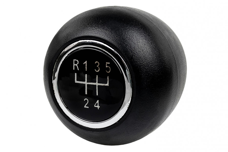 Круглая ручка КПП с кулисным приводом из черного пластика (шагрень) с хромированным кольцом на Лада Калина первого поколения.