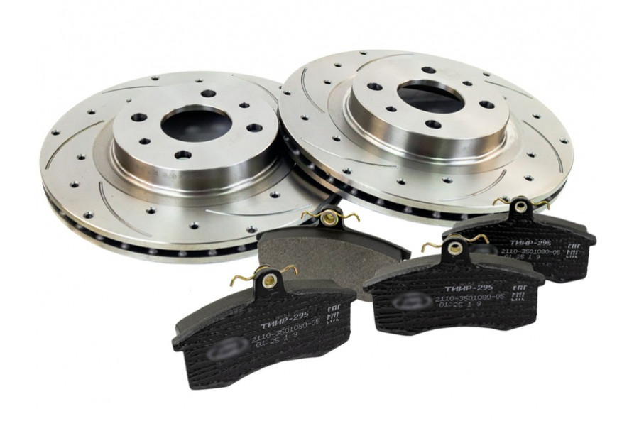 - Комплект: 2 тормозных диска, колодки (4 элемента)