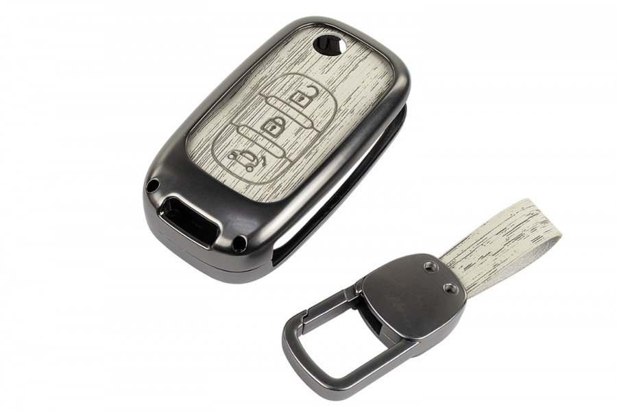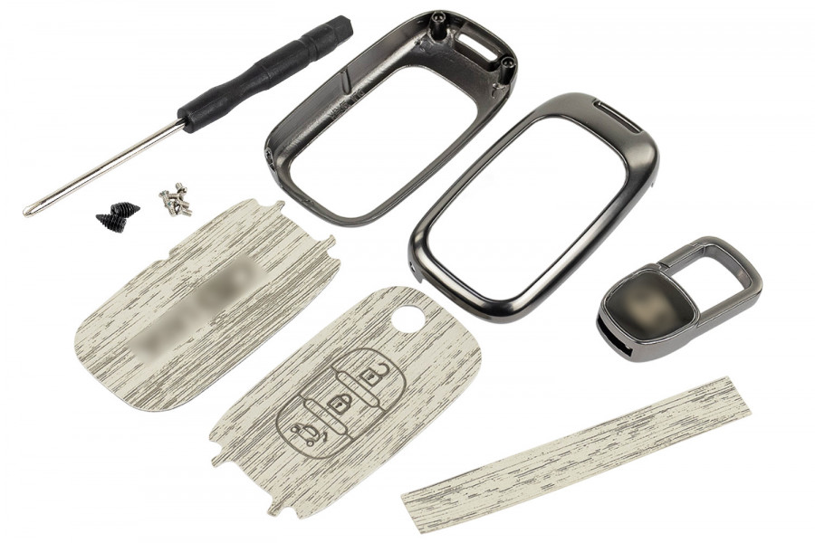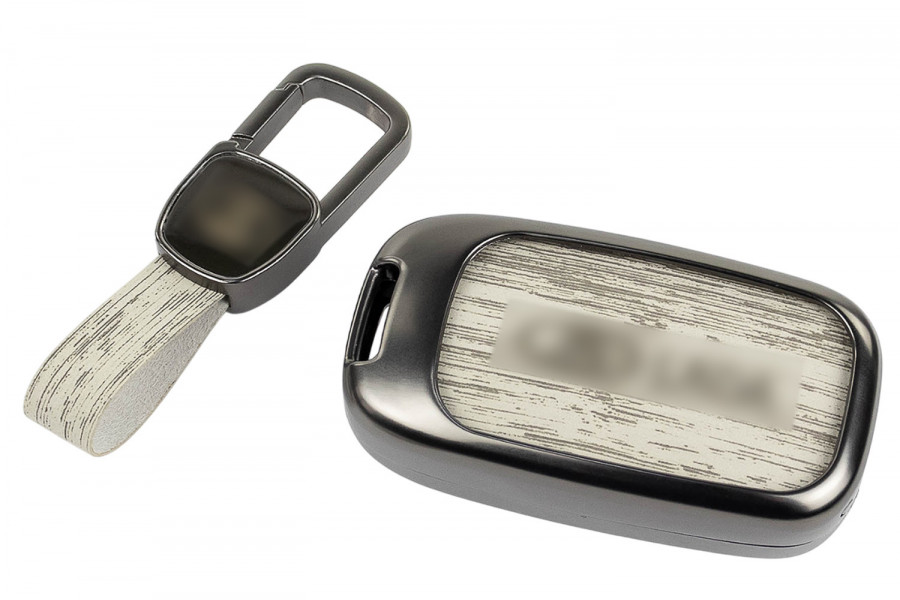 Ключ имеет выкидной механизм, что делает его удобным в использовании и практичным в хранении, а алюминиевый чехол ключа с элегантной текстурой под серое дерево станет стильным аксессуаром для вашего автомобиля.