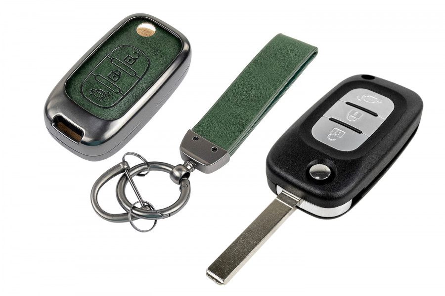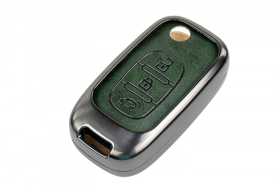 Ключ имеет выкидной механизм, что делает его удобным в использовании и практичным в хранении, а алюминиевый чехол ключа с элегантной текстурой под зеленую кожу станет стильным аксессуаром для вашего автомобиля.