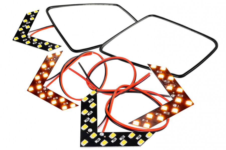 Диодные стрелки повторители поворотников устанавливаются непосредственно на зеркальный элемент под нагревательные элементы.